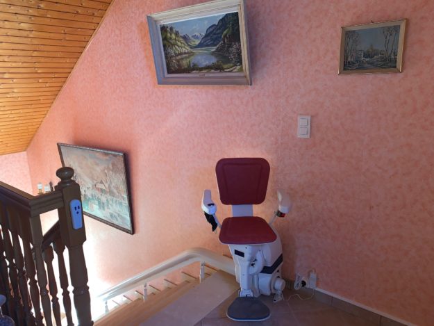 Unique et exclusif ! Ce modèle de monte escalier permet de démarrer sur la première marche permettant ainsi l’ouverture de la porte d’entrée. La propriétaire en est ravie ! NOEL CERNEUX dans le Haut Doubs.